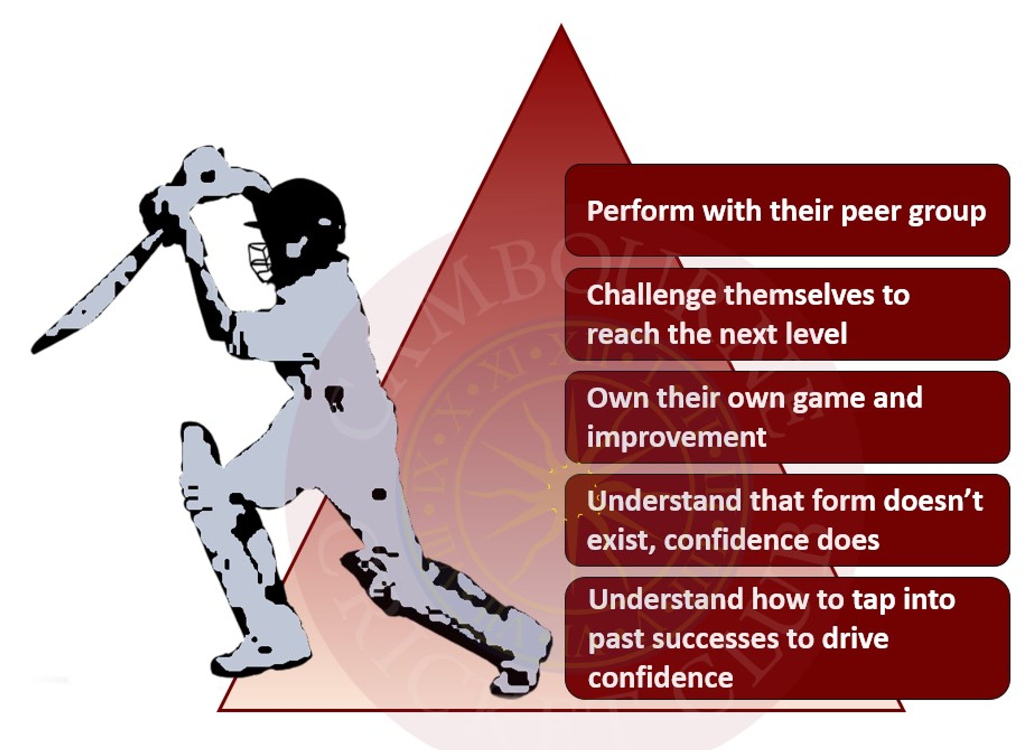 Prepare players for advanced, competitive cricket by fostering mastery and leadership.